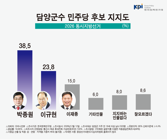 이번 여론조사는 오피니언뷰의 의뢰로 한국정책연구원이 2026년 2월 12일 하루 동안 전라남도 담양군에 거주하는 만 18세 이상 남녀 503명을 대상으로 실시했습니다. 피조사자 선정방법은 통신사가 제공한 휴대전화 가상번호(무선) 100%를 활용하여 무작위로 추출했으며, 조사방법은 구조화 된 질문지를 이용한 자동응답(ARS) 방식으로 진행되었습니다. 표본오차는 95% 신뢰수준에 ±4.4%포인트이며, 응답률은 19.85%로 집계되었습니다. 통계 보정은 2026년 1월 말 행정안전부 주민등록 인구통계를 기준으로 성별, 연령별, 지역별 가중치(셀가중)를 부여하는 방식으로 이루어졌습니다. 자세한 내용은 중앙선거여론조사심의위원회 홈페이지를 참조하면 됩니다.